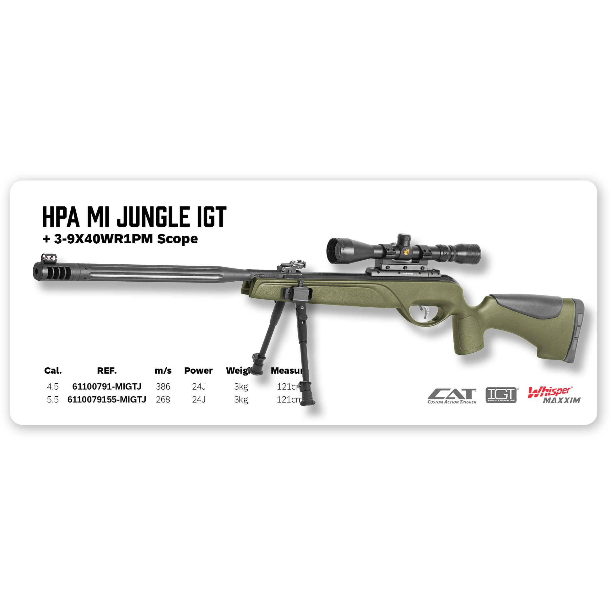 Gamo’s HPA Mi is a tactic air rifle composed of a Whisper barrel and a last generation polymer stock, which features Gamo’s IGT technology, an innovative system that replaces the traditional main spring by a last generation pneumatic cylinder, improving its terminal velocity, providing a more consistent power level, reducing cocking efforts and lessening undesired vibrations. This outstanding airgun features a CAT custom trigger that can be adjusted in two independent phases, a last generation SWA  rubber pad and an adjustable cheekpiece. This striking air rifle is additionally incorporating a brand new tactic folding bipod which can be adjusted in extension and position to provide a stable firing position in a matter of seconds.
