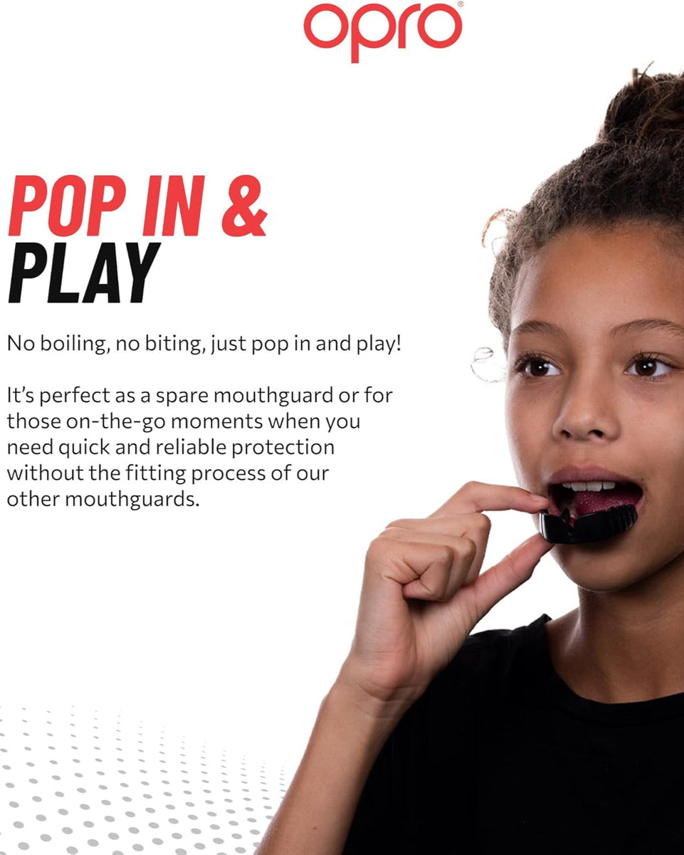 Need quick fit protection? Get it in an instant with OPRO’s Snap-Fit Mouthguard. With over 25 years of expertise and 2 Queen’s awards for Innovation… even when you’re fitting basic, fit it with the best from OPRO. Provides entry-level comfort and protection without the need for boiling or moulding. Perfect as a spare or back up gum shield when playing ball, stick and combat sports. Just simply pop in and play. Standard impact defence against dental injuries. Whatever your sport, whatever your style. Do it with OPRO.